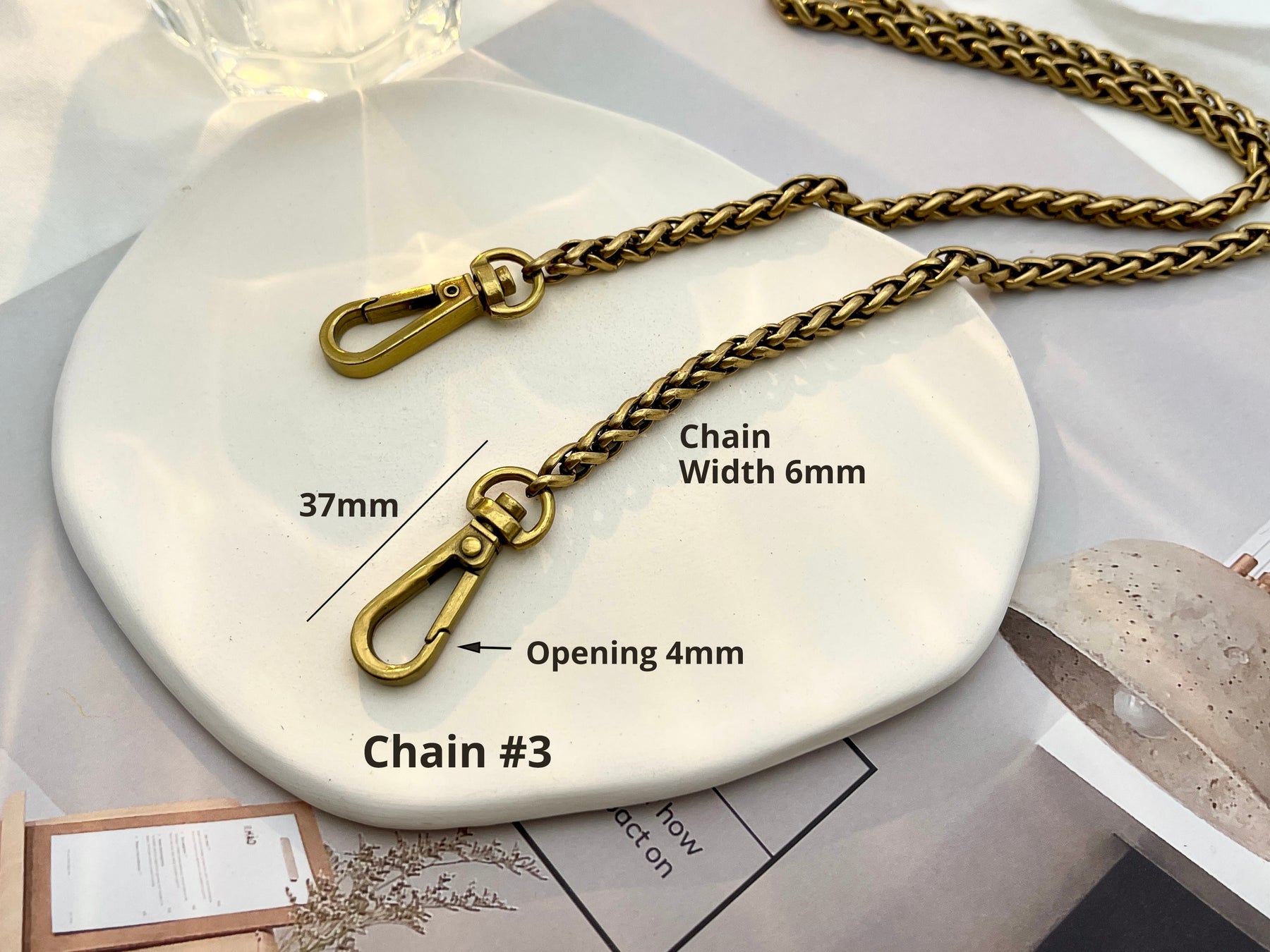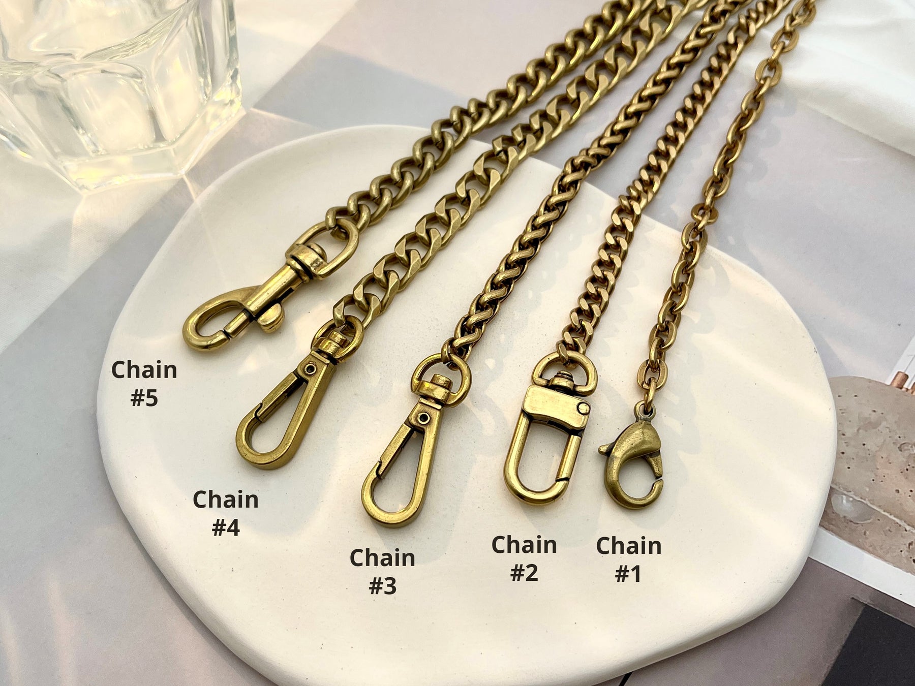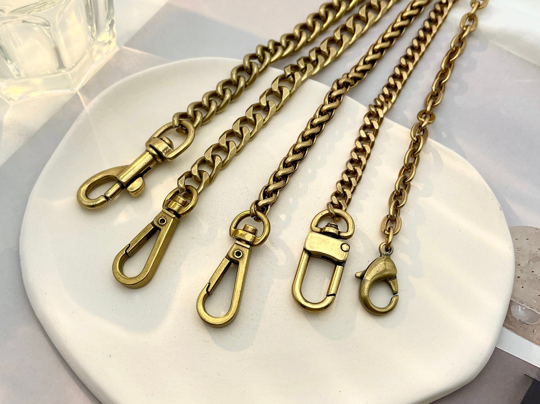 Elevate your bags with our high-quality bag chain straps. Available in an antique gold color, these straps offer a touch of elegance to your accessories. Choose from five different chain styles to suit your style and preference. Crafted with durability in mind, these bag chain straps are designed to withstand everyday use.