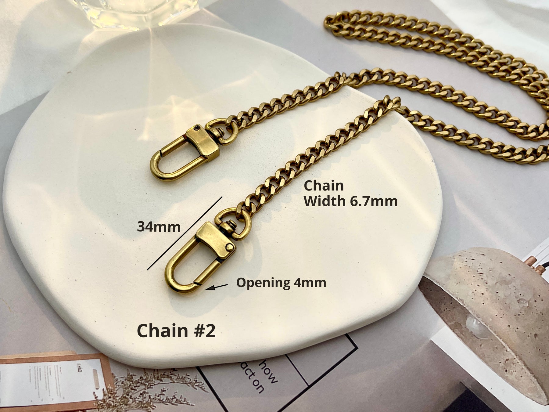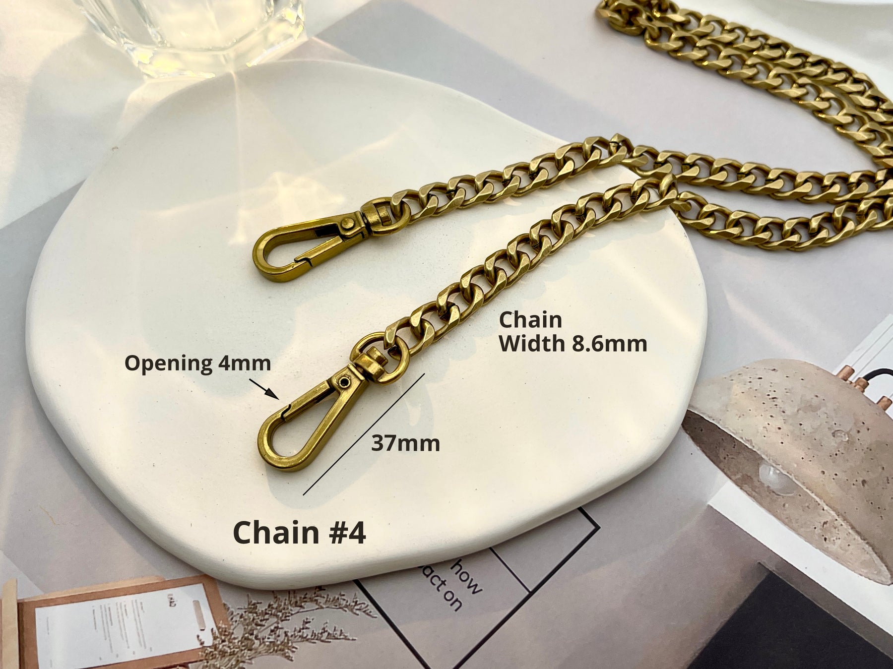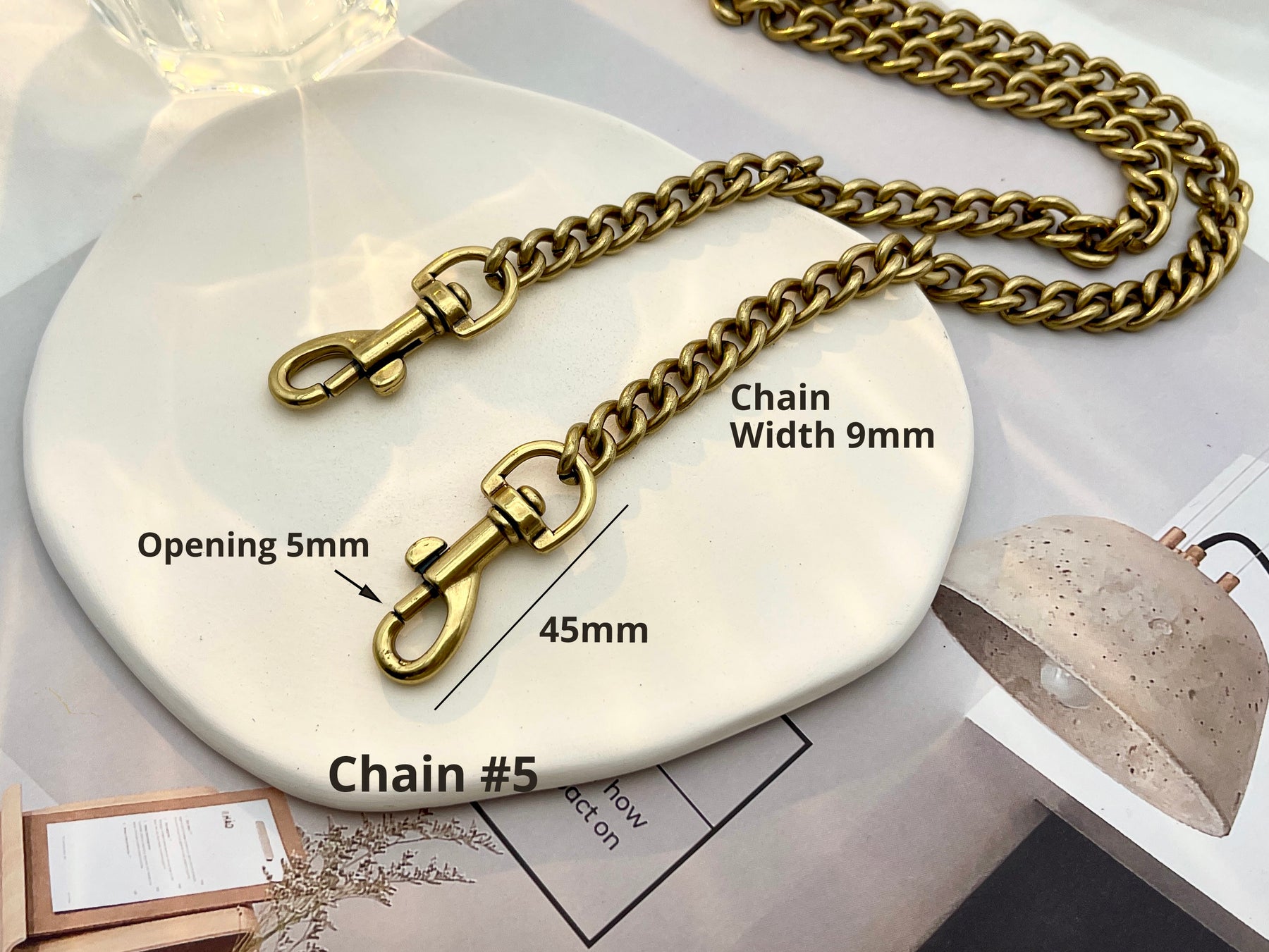 Elevate your bags with our high-quality bag chain straps. Available in an antique gold color, these straps offer a touch of elegance to your accessories. Choose from five different chain styles to suit your style and preference. Crafted with durability in mind, these bag chain straps are designed to withstand everyday use.