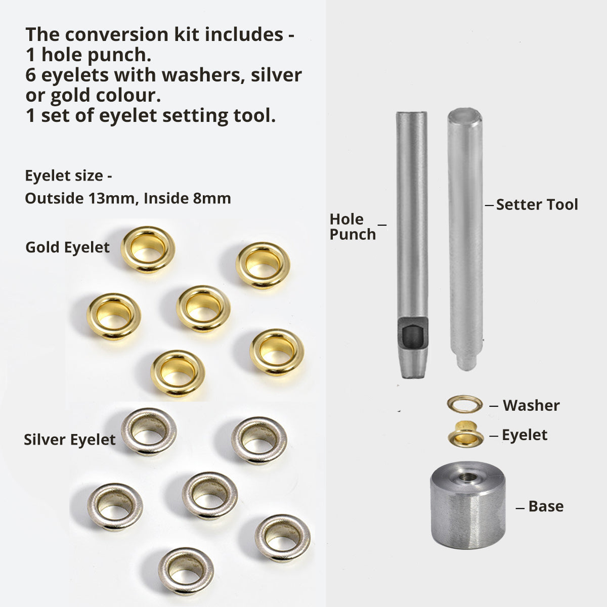 - This Longchamp Leather DIY Conversion Kit includes 1 hole punch, 1 set of eyelet setter tools, and 6 eyelets in gold or 6 eyelets in silver with washers. The colour of the eyelets will match the colour of your chosen strap hardware. Please test on other similar materials before working on your bag. Hammer not included.
